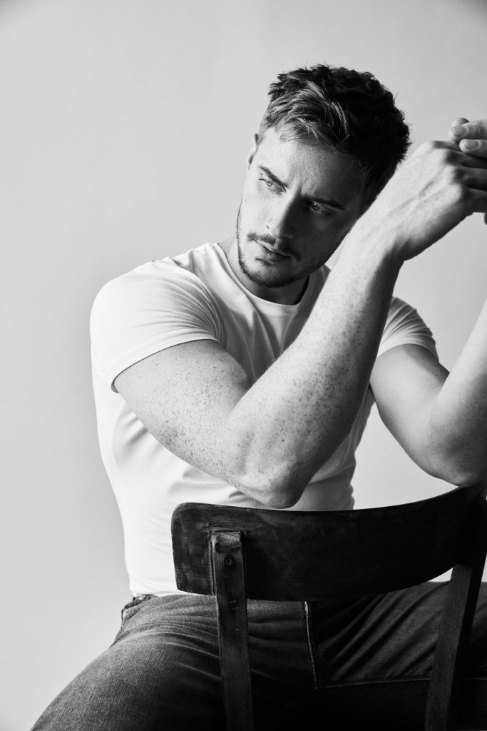 White t-shirt, David Gandy Wellwear; jeans, Lacoste; shoes, Grenson; socks, London Sock Co.