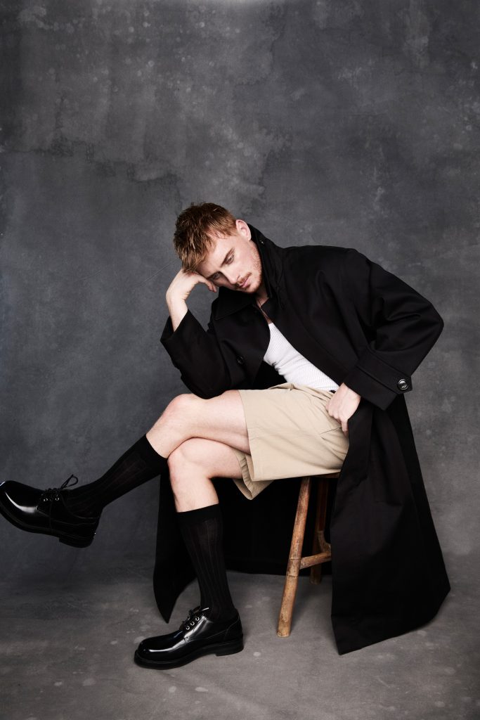 Black coat, ami @ Designer Exchange; shoes, Dior; socks, Sock Shop; shorts, vintage; white vest, stylist’s own